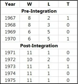 To illustrate how weakening such an arbitrarily restrictive approach can be, take a look at how the University of Alabama football team performed before and after it integrated racially. In 1970, the University of Southern California’s football team, a fully-integrated team, traveled to play Alabama, a still segregated team. USC won the game 42 to 21. Sam Cunningham, a USC running back, had twelve carries for 135 yards and two touchdowns in the first quarter alone. This thrashing convinced Alabama of the need to integrate, and, in 1971 Alabama recruited its first Black player. The Crimson Tide’s wins, losses and ties in the years before integrating and after speak for themselves.